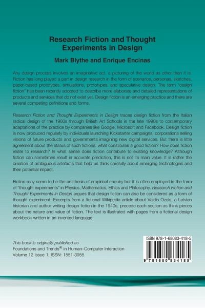 Any design process involves an imaginative act, a picturing of the world as other than it is. Fiction has long played a part in design research in the form of scenarios, personas, sketches, paper-based prototypes, simulations, prototypes, and speculative design. The term "design fiction" has been recently adopted to describe more elaborate and detailed representations of products and services that do not exist yet. Design fiction is an emerging practice and there are several competing definitions and forms. Research Fiction and Thought Experiments in Design traces design fiction from the Italian radical design of the 1960s through British Art Schools in the late 1990s to contemporary adaptations of the practice by companies like Google, Microsoft and Facebook. Design fiction is now produced regularly by individuals launching Kickstarter campaigns, corporations selling visions of future products and governments imagining new digital services. But there is little agreement about the status of such fictions: what constitutes a good fiction? How does fiction relate to research? In what sense does fiction contribute to existing knowledge? Although fiction can sometimes result in accurate prediction, this is not its main value. It is rather the creation of ambiguous artefacts that help us think carefully about emerging technologies and their potential impact. Fiction may seem to be the antithesis of empirical enquiry but it is often employed in the form of "thought experiments" in Physics, Mathematics, Ethics and Philosophy. Research Fiction and Thought Experiments in Design argues that design fiction can also be considered as a form of thought experiment. Excerpts from a fictional Wikipedia article about Valdis Ozols, a Latvian historian and author writing design fiction in the 1940s, precede each section as think pieces about the nature and value of fiction. The text is illustrated with pages from a fictional design workbook written in an invented language.