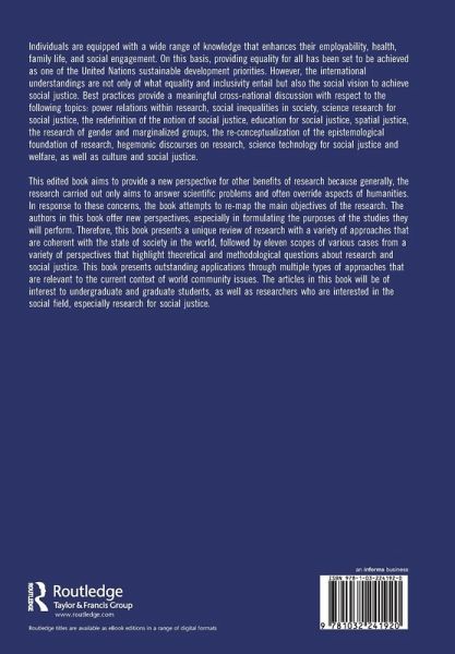 Individuals are equipped with a wide range of knowledge that enhances their employability, health, family life, and social engagement. On this basis, providing equality for all has been set to be achieved as one of the United Nations sustainable development priorities. However, the international understandings are not only of what equality and inclusivity entail but also the social vision to achieve social justice. Best practices provide a meaningful cross-national discussion with respect to the following topics: power relations within research, social inequalities in society, science research for social justice, the redefinition of the notion of social justice, education for social justice, spatial justice, the research of gender and marginalized groups, the re-conceptualization of the epistemological foundation of research, hegemonic discourses on research, science technology for social justice and welfare, as well as culture and social justice. This edited book aims to provide a new perspective for other benefits of research because generally, the research carried out only aims to answer scientific problems and often override aspects of humanities. In response to these concerns, the book attempts to re-map the main objectives of the research. The authors in this book offer new perspectives, especially in formulating the purposes of the studies they will perform. Therefore, this book presents a unique review of research with a variety of approaches that are coherent with the state of society in the world, followed by eleven scopes of various cases from a variety of perspectives that highlight theoretical and methodological questions about research and social justice. This book presents outstanding applications through multiple types of approaches that are relevant to the current context of world community issues. The articles in this book will be of interest to undergraduate and graduate students, as well as researchers who are interested in the social field, especially research for social justice.