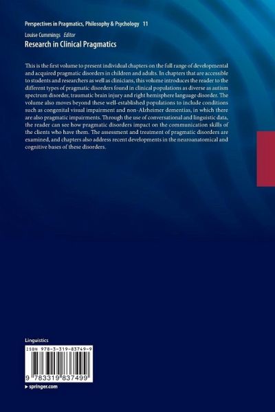 "Louise Cummings's edited volume, Research in Clinical Pragmatics, is without doubt a timely and welcome contribution to the field. Besides being a very informative volume, it will also appeal to a wide readership. Although the book will appeal primarily to clinicians, the manner in which the contributors have explained and simplified specialised technical items has resulted in this volume being accessible to readers from different fields of inquiry and background knowledge." (Vahid Parvaresh, Journal of Linguistics, August, 2017)