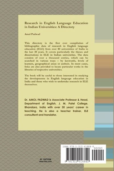 This directory is the first ever compilation of bibliographic data of research in English language education (ELE) from over 80 universities of India in the last 30 years. It covers particularly the theses and dissertations in ELE in Indian universities. The data consists of over a thousand entries, which can be searched in various ways - by keywords, levels of learners, geographical areas, universities or authors. In most cases, links are also provided to locate particular works in the libraries of respective universities. The book will be useful to those interested in studying the developments in English language education in India and those who wish to undertake research in ELE themselves.