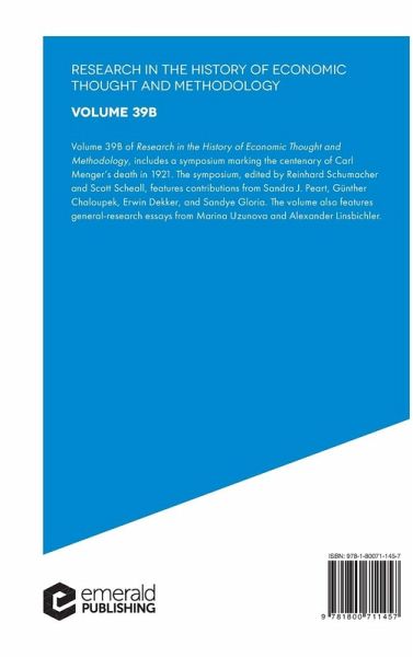 Volume 39B includes a symposium marking the centenary of Carl Menger's death in 1921. The symposium, edited by Reinhard Schumacher and Scott Scheall, features contributions from Sandra J. Peart, Günther Chaloupek, Erwin Dekker, and Sandye Gloria. The Volume also features general-research essays from Marina Uzunova and Alexander Linsbichler.