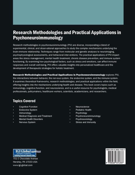 Research methodologies in psychoneuroimmunology (PNI) are diverse, incorporating a blend of experimental, clinical, and observational approaches to study the complex mechanisms underlying the brain-immune relationship. Techniques range from molecular and genetic analyses to neuroimaging, psychophysiological assessments, and behavioral interventions. The practical applications of PNI impact areas like stress management, mental health treatment, chronic disease prevention, and immune system functioning. By examining how psychological factors, such as stress and emotions, can affect immune responses and overall well-being, PNI offers valuable insights into personalized healthcare and the development of therapeutic strategies for holistic treatment. Research Methodologies and Practical Applications in Psychoneuroimmunology explores PNI, the interactions between behavior, the nervous system, the endocrine system, and the immune system. It examines theoretical frameworks, research methodologies, and practical applications within the field, offering insights into the mechanisms underlying health and disease. This book covers topics such as immunology, cognitive function, and neuroscience, and is a useful resource for psychologists, medical professionals, policymakers, healthcare workers, scientists, academicians, and researchers.