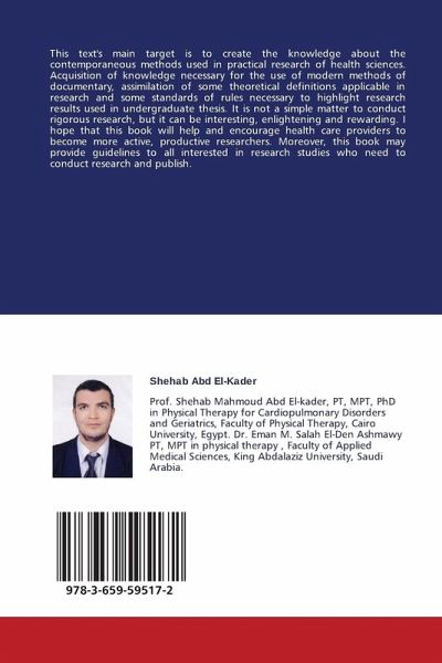 This text's main target is to create the knowledge about the contemporaneous methods used in practical research of health sciences. Acquisition of knowledge necessary for the use of modern methods of documentary, assimilation of some theoretical definitions applicable in research and some standards of rules necessary to highlight research results used in undergraduate thesis. It is not a simple matter to conduct rigorous research, but it can be interesting, enlightening and rewarding. I hope that this book will help and encourage health care providers to become more active, productive researchers. Moreover, this book may provide guidelines to all interested in research studies who need to conduct research and publish.