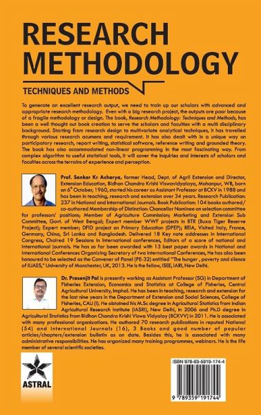To generate an excellent research output, we need to train up our scholars with advanced and appropriate research methodology. Even with a big research project, the outputs are poor because of a fragile methodology or design. The book, Research Methodology: Techniques and Methods, has been a well thought out book creation to serve the scholars and faculties with a multi disciplinary background. Starting from research design to multivariate analytical techniques, it has travelled through various research acumens and requirement. It has also dealt with in a unique way on participatory research, report writing, statistical software, reference writing and grounded theory. The book has also accommodated non-linear programming in the most fascinating way. From complex algorithm to useful statistical tools, it will cover the inquiries and interests of scholars and faculties across the terrains of experience and perception.