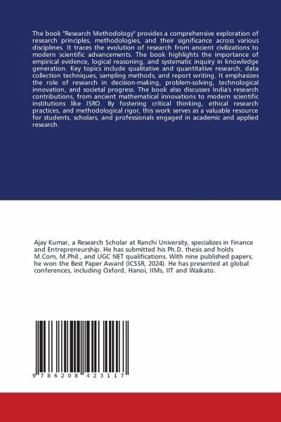The book "Research Methodology" provides a comprehensive exploration of research principles, methodologies, and their significance across various disciplines. It traces the evolution of research from ancient civilizations to modern scientific advancements. The book highlights the importance of empirical evidence, logical reasoning, and systematic inquiry in knowledge generation. Key topics include qualitative and quantitative research, data collection techniques, sampling methods, and report writing. It emphasizes the role of research in decision-making, problem-solving, technological innovation, and societal progress. The book also discusses India's research contributions, from ancient mathematical innovations to modern scientific institutions like ISRO. By fostering critical thinking, ethical research practices, and methodological rigor, this work serves as a valuable resource for students, scholars, and professionals engaged in academic and applied research.
