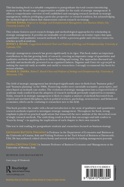 The field of strategic management has developed significantly since its birth from "business policy" and "business planning" in the 1960s. Pioneering studies were essentially normative, prescriptive and often based on in-depth case studies. The evolution of strategic management into a respected field of academic study resulted from the adoption of research methods previously employed in economics. Today, research in strategic management is likely to employ a mixture of methods which can be confusing to researchers new to the field. This book provides the reader with a broad introduction to the array of qualitative and quantitative research methods required to investigate strategic management. Throughout the book, strong emphasis is placed on practical applications that transcend the mere analysis of the theoretical roots of single research methods. The underlying result is a book that encourages and aids readers to "learn by doing" - in applying the implications of each chapter to their own research. This text is vital reading for postgraduate students and researchers focused on business strategy.