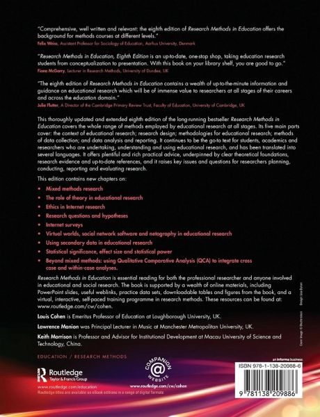 This rewritten, expanded and updated 8th edition of the long-running bestseller Research Methods in Education is the most comprehensive and accessible introductory text in the field. Thoroughly updated with nine new chapters, this new edition offers rich practical advice underpinned by clear, theoretical foundations.