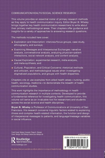 This volume provides an essential roster of primary research methods as they apply to health communication inquiry. Editor Bryan B. Whaley brings together key health communication researchers to write about their primary methodological areas. Their chapters offer guidance and insights for a variety of approaches to answering research questions. The methods included here cover: Exploration and Description: interview/focus groups, case study, ethnography, and surveys; Examining Messages and Interpersonal Exchanges: narrative analysis, conversational analysis, analyzing physician-patient interactions, social network analysis, and content analysis; Causal Explication: experimental research, meta-analysis, and meta-synthesis; and Cultural, Population, and Critical Concerns: rhetorical methods and criticism, and methodological issues when investigating stigmatized populations, and groups with health disparities. Chapters cite or use examples from allied health areas -- nursing, public health, sociology, medicine -- to demonstrate the breadth of health communication studies. This work highlights the importance of methodology in health communication research in multiple contexts. Developed to provide a fundamental reference for investigating health communication, this volume will serve as an invaluable tool for researchers and students across the social science and health disciplines.