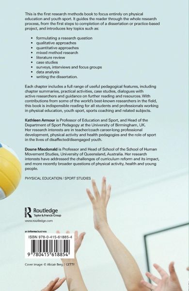 This is the first research methods book to focus entirely on physical education and youth sport. It guides the reader through the whole research process; from the first steps to completion of a dissertation or practice-based project, and introduces key topics such as: formulating a research question qualitative approaches quantitative approaches mixed method research literature review case studies survey, interviews and focus groups data analysis writing the dissertation. Each chapter includes a full range of useful pedagogical features, including chapter summaries, practical activities, case studies, dialogues with active researchers and guidance on further reading and resources. With contributions from some of the world's best-known researchers in the field, this book is indispensible reading for all students and professionals working in physical education, youth sport, sports coaching and related subjects.