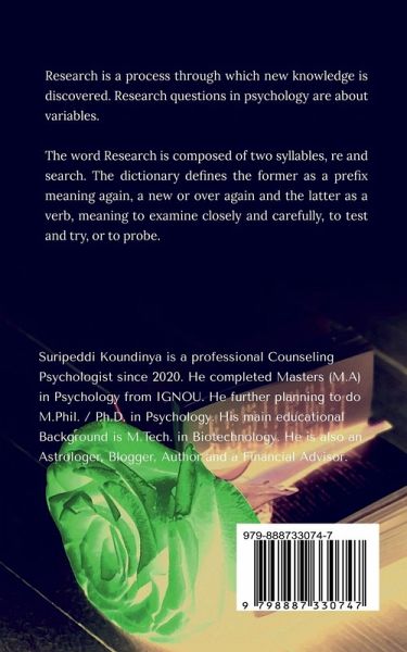 Research is a process through which new knowledge is discovered. Research questions in psychology are about variables. A variable is a quantity or quality that varies across people or situations. For example, the height of the students in a psychology class is a variable because it varies from student to student. The sex of the students is also a variable as long as there are both male and female students in the class. A quantitative variable is a quantity, such as height, that is typically measured by assigning a number to each individual. Other examples of quantitative variables include people's level of talkativeness, how depressed they are, and the number of siblings they have. A categorical variable is a quality, such as sex, and is typically measured by assigning a category label to each individual. Other examples include people's nationality, their occupation, and whether they are receiving psychotherapy. Researchers in psychology are usually interested in drawing conclusions about some very large group of people. This is called the population. It could be American teenagers, children with autism, professional athletes, or even just human beings-depending on the interests and goals of the researcher. But they usually study only a small subset or sample of the population. This Book is useful for Students pursuing M.A. (Master of Arts) in Psychology studying in Universities such as IGNOU, Nalanda, Andhra, Kakatiya, BHU, Kota, Tamilnadu, Bihar, Rajasthan, etc.