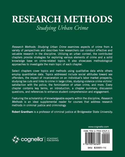 Research Methods: Studying Urban Crime examines aspects of crime from a variety of perspectives and describes how researchers can conduct effective and valuable research in the discipline. Utilizing an urban context, the contributed chapters provide strategies for exploring various elements of crime and a solid knowledge base on crime-related topics. It also showcases methodological approaches to investigate the main topic of each chapter. Select chapters cover topics and methods using qualitative data while others employ quantitative data. Topics addressed include social attitudes toward sex offenders, the impact of incarceration on an individual's labor market prospects, studying tax cuts and links to crime in large cities, studying violence crime victims' satisfaction with the police, the feminization of urban crime, and more. Every chapter contains key terms, an introduction, a chapter summary, discussion questions, and references to enhance student comprehension and engagement. Featuring the scholarship of knowledgeable experts within the discipline, Research Methods is an ideal supplemental reader for courses that address research methods in criminal justice and criminology.