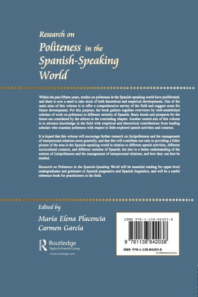 One of the main contributions of this important book is that it offers a thorough survey of the theoretical and empirical developments that have occurred in the area of (im)politeness in the different regions of the Spanish-speaking world, gathering together overviews by distinguished scholars. Additionally, the book advances the field with new empirical research on linguistic (im)politeness, and silence and (im)politeness, in a range of (non)institutional contexts, as well as new perspectives for the study of (im)politeness. A closing chapter by the editors provides an assessment of salient trends in the area and directions for future research. Research on Politeness in the Spanish-Speaking World is essential reading for students in Spanish pragmatics and Spanish linguistics, sociolinguistics, and discourse analysis. The volume is also very useful to English-speaking scholars in the general field of pragmatics who are not proficient in Spanish but require access to these empirical studies.