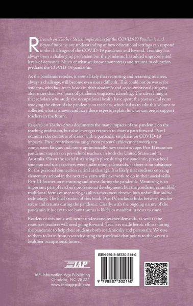 This volume informs our understanding of how educational settings can respond to the challenges of the COVID-19 pandemic and beyond. Teaching has always been a challenging profession but the pandemic has added unprecedented levels of demands. Much of what we know about stress and trauma in education predates the COVID-19 pandemic. As the pandemic recedes, it seems likely that recruiting and retaining teachers, always a challenge, will become even more difficult. This could not be worse for students, who face steep losses in their academic and socio-emotional progress after more than two years of pandemic-impacted schooling. The silver lining is that scholars who study the occupational health have spent the past several years studying the effect of the pandemic on teachers, which led us to edit this volume to collected what is known and have these experts explain how we can better support teachers in the future. This book documents the many impacts of the pandemic on the teaching profession, but also leverages research to chart a path forward. Part I examines the contours of stress, with a particular emphasis on COVID-19 impacts. These contributions range from parents' achievement worries to compassion fatigue, and, more optimistically, how teachers cope. Part II examines pandemic impacts on pre-school teachers, in both the U.S. and in Australia. Given the social distancing in place during the pandemic, pre-school students and their teachers were under unique demands, as there is no substitute for the personal connection critical at that age. It is likely that students entering elementary school in the next few years will have work to do in their social skills. Part III focuses on mentoring and stress during the pandemic. Mentoring is an important part of teacher's professional development, but the pandemic scrambled traditional forms of mentoring as all teachers were thrown into unfamiliar online technology. The final section of this book, Part IV, includes links between teacher stress and trauma during the pandemic. Clearly, with the ongoing nature of the pandemic, it is easy to see how trauma is likely to manifest in years to come. Readers of this book will better understand teacher demands, as well as the resources teachers will need going forward. Teachers made heroic efforts during the pandemic to help their students both academically and personally. We owe to them to learn from research during the pandemic that points to the way to a healthier occupational future.