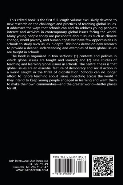 This edited book is the first full-length volume exclusively devoted to new research on the challenges and practices of teaching global issues. It addresses the ways that schools can and do address young people's interest and activism in contemporary global issues facing the world. Many young people today are passionate about issues such as climate change, world poverty, and human rights but have few opportunities in schools to study such issues in depth. This book draws on new research to provide a deeper understanding and examples of how global issues are taught in schools. The book is organized in two sections: (1) contexts and policies in which global issues are taught and learned; and (2) case studies of teaching and learning global issues in schools. The central thesis is that global issues are an essential feature of democracy and social action in a world caught in the thrall of globalization. Schools can no longer afford to ignore teaching about issues impacting across the world if they intend to keep young people engaged in learning and want them to make their own communities-and the greater world-better places for all.
