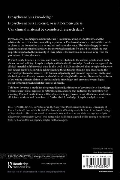 Is psychoanalysis knowledge? Is psychoanalysis a science, or is it hermeneutics? Can clinical material be considered research data? Psychoanalysis is ambiguous about whether it is about meaning or about truth, and the relations between these two compelling experiences. Psychoanalysts often think of their work as closer to the humanities than to medical and natural science. The wider the gap between science and psychoanalysis appears, the more psychoanalysts feel pulled to something that respects subjectivity, the humanity of their patients themselves, and move away from the procedures of natural science. Research on the Couch is a relevant and timely contribution to the current debate about both the nature and validity of psychoanalysis and its body of knowledge. Freud always regarded his clinical material as his research data. In this book R.D. Hinshelwood aims to explore that view and defend Freud's claim whilst acknowledging the criticisms of single case studies and the inevitable problems for research into human subjectivity and personal experience. To this end the book reviews Freud's own methods of disseminating his discoveries, discusses the problem of evaluating different claims to psychoanalytic knowledge, and presents a cogent logical model for testing psychoanalytic theories clinically. This book evolves a model for the generation and justification of psychoanalytic knowledge, a 'parascience' just as rigorous as natural science, and one that addresses the subjectivity of meaning. Research on the Couch will be of interest to psychoanalysts of all schools, academics, clinicians, students and those keen to further their knowledge of psychoanalytic studies.