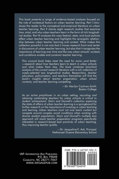 This book presents a range of evidence-based analyses focused on the role of contextual factors on urban teacher learning. Part I introduces the reader to the conceptual and empirical literature on urban teacher learning. Part II shares eight research studies that examine how, what, and why urban teachers learn in the form of rich longitudinal studies. Part III analyzes the ways federal, state, and local policies affect urban teacher learning and highlights the synergistic relationship between urban teacher learning and context. What makes this collection powerful is not only that it moves research front and center in discussions of urban teacher learning, but also that it recognizes the importance of learning over time and the way urban schools' contexts and conditions enable and constrain teacher learning. ENDORSEMENTS: This unusual book helps meet the need for more-and better-research about how teachers learn to teach in urban schools and what makes them stay. The book combines trenchant analysis of the current research literature with a rich collection of wisely-selected new longitudinal studies. Researchers, teacher educators, policymakers, and teachers themselves will find the book's insights about teacher preparation, urban school contexts, and teacher learning compelling. - Dr. Marilyn Cochran-Smith, Boston College As an active practitioner in an urban setting, recruiting and retaining outstanding teachers for urban schools is critical to student achievement. Stairs and Donnell's collection exploring the state of affairs of urban teacher learning is a springboard for further research on the importance of investing in urban teaching and learning. Urban teachers must not only teach content but navigate around complex social conditions when working with diverse student populations. Stairs and Donnell's multiple lens approach will assist teacher preparation programs specifically interested in research-based best practices of urban teaching, thus improving teacher quality. - Dr. Jacqueline E. Ash, Nathanael Greene Elementary School