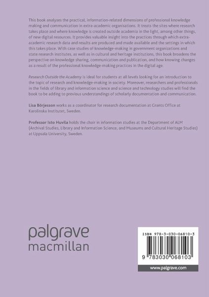 Research outside the Academy is ideal for students at all levels looking for an introduction to the topic of research and knowledge-making insociety. Moreover, researchers and professionals in the fields of library and information science and science and technology studies will find the book to be adding to previous understandings of scholarly documentation and communication.