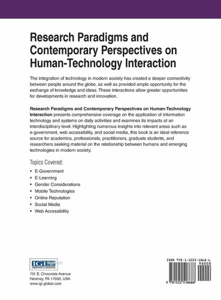 The integration of technology in modern society has created a deeper connectivity between people around the globe, as well as provided ample opportunity for the exchange of knowledge and ideas. These interactions allow greater opportunities for developments in research and innovation. Research Paradigms and Contemporary Perspectives on Human-Technology Interaction presents comprehensive coverage on the application of information technology and systems on daily activities and examines its impacts at an interdisciplinary level. Highlighting numerous insights into relevant areas such as e-government, web accessibility, and social media, this book is an ideal reference source for academics, professionals, practitioners, graduate students, and researchers seeking material on the relationship between humans and emerging technologies in modern society.