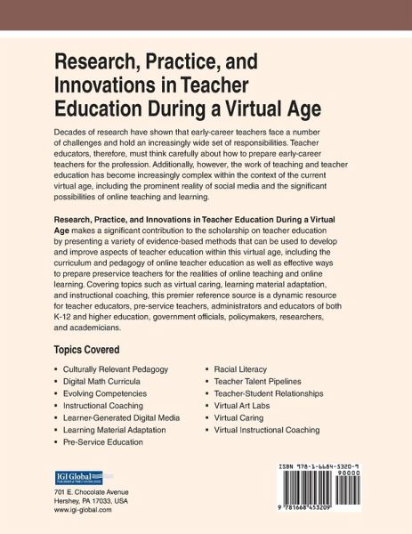 Decades of research have shown that early-career teachers face a number of challenges and hold an increasingly wide set of responsibilities. Teacher educators, therefore, must think carefully about how to prepare early-career teachers for the profession. Additionally, however, the work of teaching and teacher education has become increasingly complex within the context of the current virtual age, including the prominent reality of social media and the significant possibilities of online teaching and learning. Research, Practice, and Innovations in Teacher Education During a Virtual Age makes a significant contribution to the scholarship on teacher education by presenting a variety of evidence-based methods that can be used to develop and improve aspects of teacher education within this virtual age, including the curriculum and pedagogy of online teacher education as well as effective ways to prepare preservice teachers for the realities of online teaching and online learning. Covering topics such as virtual caring, learning material adaptation, and instructional coaching, this premier reference source is a dynamic resource for teacher educators, pre-service teachers, administrators and educators of both K-12 and higher education, government officials, policymakers, researchers, and academicians.