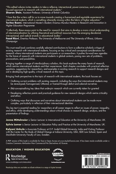 This must-read book combines carefully selected contributions to form a collective scholarly critique of existing research with international students, focusing on key critical and conceptual considerations for research where international students are participants or co-researchers.