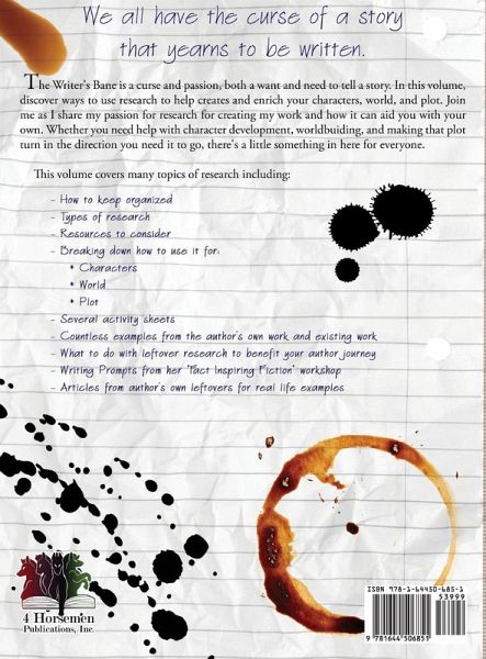 We all have the curse of a story that yearns to be written. The Writer's Bane is a curse and passion, both a want and need to tell a story. In this volume, discover ways to use research to help creates and enrich your characters, world, and plot. Join me as I share my passion for research for creating my work and how it can aid you with your own. Whether you need help with character development, worldbuilding, and making that plot turn in the direction you need it to go, there's a little something in here for everyone. This volume covers many topics of research including: How to keep organized Types of research Resources to consider Breaking down how to use it for: Characters World Plot Several activity sheets Countless examples from the author's own work and existing work What to do with leftover research to benefit your author journey Writing Prompts from her "Fact Inspiring Fiction" workshop Articles from author's own leftovers for real life examples