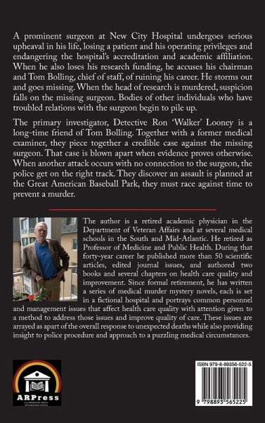 A prominent surgeon at New City Hospital undergoes serious upheaval in his life, personal and professional. His son leaves home and his whereabouts are unknown. The surgeon is involved in an operative death and his operating privileges are removed. The death endangers the hospital's accreditation and academic affiliation. When the surgeon also loses his research funding, he loses control and accuses his chairman and Tom Bolling, chief of staff, of ruining his career. He storms out of the hospital and goes missing. When the head of research is murdered, suspicion immediately falls on the missing surgeon for several forensic reasons. Bodies of other individuals who have had troubled relations with the surgeon begin to pile up. The primary investigator, Detective Ron 'Walker' Looney is a long-time friend of Tom Bolling as they were both in the air force, Looney as a Master Sargent and Bolling as a Brigadier General. These two different men, together with a former medical examiner, piece together a credible case against the missing surgeon. That case is blown apart when hard evidence is found that proves otherwise. When another attack occurs with no connection to the surgeon, the detectives revise the list of "Knowns' and get on the right track. But, they discover another assault is planned at the Great American Baseball Park, and they have a race against time or another murder will occur.