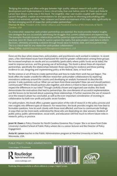 Gone are the days when researchers, policymakers, and practitioners each worked in isolation. In recent years, a few interrelated issues have emphasized the need for greater collaboration among these groups: the increased emphasis on results and accountability (particularly where public funds are at stake), the need to improve services, and the growing use of technology. This book is about these all-important partnerships, specifically the relationships between those searching for evidence and those putting evidence to use, designing and implementing policy at the federal, state, or local level. Yet the science or art of how to create partnerships and how to make them work has just begun. This book offers the reader a toolkit for effective researcher/policymaker collaborations by exploring innovations underway around the country and developing an analytic framework to describe the process. It asks questions such as: What can we learn from these examples? How can and should partners communicate? Where should partners plan together, and where is it best to leave some separation to respect the differences in our roles? Through carefully chosen and organized case studies, this book demonstrates the motivations that lead to partnerships, the core elements of successful implementation, and the lessons to be learned about sustaining these relationships. It further examines the use of research once the research phase has concluded, as well as the ever-important consideration of investing in collaboration by both non-profit and public sector funders. For policymakers, this book offers a greater appreciation of the role of research in the policy process and new insights into different types of research. For researchers, the book provides insights into how best to formulate questions, how to work closely with those most affected, and how to communicate findings in ways that can be more easily understood by those who are depending on clear answers. Students of public policy, public administration, social work, and education will find much to inform future roles in research, policy or practice.