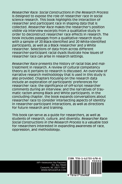 Researcher Race: Social Constructions in the Research Process is designed to expose the role of researcher race in social science research. This book highlights the interaction of researcher and participant race in shaping data that is collected. Researcher Race makes the researcher's position visible via interview excerpts from a qualitative study in order to deconstruct researcher race effects in research. The book includes passages from a qualitative research study with a sample of 20 Black-identified and 20 White-identified participants, as well as a Black researcher and a White researcher. Selections of data from across different researcher-participant racial dyads illustrate how issues of researcher race can arise in research settings. Researcher Race presents the history of racial bias and maltreatment in research. A review of cultural competency theory as it pertains to research is discussed. An overview of narrative research methodology that is used in this study is also provided. Chapters focused on the research data include an exploration of participants' preferences for researcher race; the significance of off-script researcher comments during an interview; and the narratives of traumatic racism among Black and White participants. In the concluding chapter, the book expands conversations about researcher race to consider intersecting aspects of identity in researcher-participant interactions, as well as directions for future research and training. This book can serve as a guide for researchers, as well as students of research, culture, and diversity. Researcher Race: Social Constructions in the Research Process is a valuable tool for researchers interested in expanding awareness of race, oppression, and methodology.