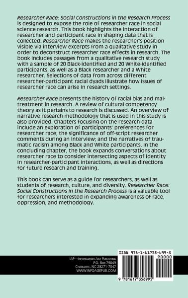 Researcher Race: Social Constructions in the Research Process is designed to expose the role of researcher race in social science research. This book highlights the interaction of researcher and participant race in shaping data that is collected. Researcher Race makes the researcher's position visible via interview excerpts from a qualitative study in order to deconstruct researcher race effects in research. The book includes passages from a qualitative research study with a sample of 20 Black-identified and 20 White-identified participants, as well as a Black researcher and a White researcher. Selections of data from across different researcher-participant racial dyads illustrate how issues of researcher race can arise in research settings. Researcher Race presents the history of racial bias and maltreatment in research. A review of cultural competency theory as it pertains to research is discussed. An overview of narrative research methodology that is used in this study is also provided. Chapters focused on the research data include an exploration of participants' preferences for researcher race; the significance of off-script researcher comments during an interview; and the narratives of traumatic racism among Black and White participants. In the concluding chapter, the book expands conversations about researcher race to consider intersecting aspects of identity in researcher-participant interactions, as well as directions for future research and training. This book can serve as a guide for researchers, as well as students of research, culture, and diversity. Researcher Race: Social Constructions in the Research Process is a valuable tool for researchers interested in expanding awareness of race, oppression, and methodology.