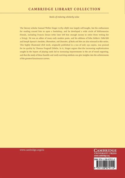 The literary scholar Samuel Weller Singer (1783-1858) was largely self-taught, but his enthusiasm for reading caused him to open a bookshop, and he developed a wide circle of bibliomaniac friends, including Francis Douce (who later left him enough money to retire from writing for a living). He was an editor of many early modern poets, and his editions of John Selden's Table-Talk and Joseph Spence's Anecdotes, Observations, and Characters, of Books and Men are also reissued in this series. This highly illustrated 1816 work, originally published in a run of only 250 copies, was praised for its quality by Thomas Frognall Dibdin. In it, Singer argues that the increasing sophistication sought by the buyers of playing cards led to increasing improvements in the art of wood engraving, and that the study of these humble and rarely surviving artefacts can give insights into the achievements of the greatest Renaissance carvers.