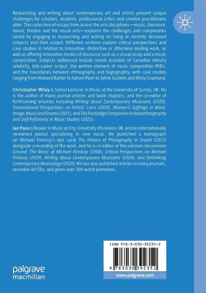 General Introduction.- 1. Writing About Contemporary Creative Art and Artists.- Christopher Wiley and Ian Pace.- PART I: Critical Perspectives.- 2. The Artist is Present: Scandal and the Academic Study of the Living Artist.- Lorraine York.- 3. From vocational calling to career construction: Late-career authors and critical self-reflection.- Hywel Dix.- 4. An Introduction to the Persistence of Art Writing.- Bob Dickinson.- 5. The purpose of the written element in composition PhDs.- Christopher Leedham and Martin Scheuregger.- 6. Ethnographic Approaches to the Study of Western Art Music: Questions of Context, Realism, Evidence, Description and Analysis.- Ian Pace.- 7. When Ethnography becomes Hagiography: Uncritical Musical Perspectives.- Ian Pace.- PART II: Case Studies Across the Arts.- 8. Writing Catastrophe: Howard Barker and the Body.- Andy W. Smith.- 9. Writing the Ballerina: Sylvie Guillem, Misty Copeland and Lessons in Biography.- Jill Brown.- 10. Amend the Arena: On Adrian Piper's Work.- Vered Engelhard.- 11. Memory and Irony in The Apollonian Clockwork.- Joel M. Baldwin.- 12. Artfrom: Researching the canon through publications of art and design.- Mimi Cabell and Phoebe Stubbs.- PART III: Art Considered on its Own Terms.- 13. Occlusionary Tactics (visual essay).-'Bob' Whalley.-14. Abstracts(music composition, 2015).- Richard Birchall.- 15. MusicArt: Creating Dialogues Across the Arts.- Annie Yim, in conversation with Christopher Wiley.