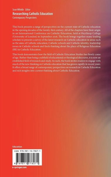 Chapter 1 Introduction: Dr Sean Whittle.- Part One: The field of Catholic education Studies: Mapping out the terrain.- Chapter 2 New Thinking, New Scholarship and New Research in Catholic Education. Some perspectives on this field of study.- Chapter 3 Diversity and Differentiation in Catholic Education.- Chapter 4 Research and Educational Practice in Catholic Education Studies.- Chapter 5 Catholic identities in Catholic schools: Fragmentation and bricolage.- Part Two: New Thinking about the politics and philosophy of Catholic education.- Chapter 6 Faith Schools in a Secular Society: should they continue?.- Chapter 7 Catholic schools as an expression of political theology.- Chapter 8 The Preferential Option for the Poor and Catholic Schools.- Chapter 9 Catholic schools, Liberalism and Strategies for the Formation of Catholic Identity.- Chapter 10 The ambiguous embrace: The pros and cons of accepting government funding.- Chapter 11 The role of Governors in Catholic Education - a neglected constituency?.- Part Three: New thinking about Catholic school leadership.- Chapter 12 Educational Leadership in Catholic Schools: a practice based theology of vocation.- Chapter 13 Interpreting the Tradition.- Chapter 14 Leadership Among School Children in a Catholic School: A courageous dance of love.- Chapter 15 Getting Embedded Together: New Partnerships for 21st Century Catholic Education.- Part Four: New thinking about Religious Education in Catholic schools.- Chapter 16 Religious Education in Catholic Second-level Schools in Ireland: Drawing on Our Heritage, Living in the Present, Anticipating New Directions.- Chapter 17 RE and Catholic education: A Scottish Perspective.- Chapter 18 Testing Times for Religious Education in Catholic Schools in England and Wales.- Chapter 19 Science and Religion in Catholic education.