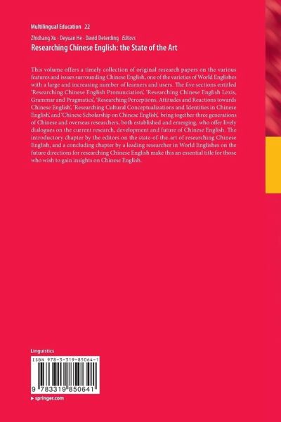 Preface by Kingsley Bolton.- What we know about Chinese English: status, issues and trends By Zhichang XU, David DETERDING, and Deyuan HE.- Part I: Researching Chinese English Pronunciation.- The Pronunciation of English in Guangxi: Which features cause misunderstandings? By David DETERDING.- The Hong Kong English Syllable Structure By Lian-Hee WEE.- Part II: Researching Chinese English Lexis, Grammar and Pragmatics.- Lexis-grammar interface in Chinese English: A corpus study of a prototypical ditransitive verb GIVE By Haiyang AI and Xiaoye YOU.- Researching Collocational Features: Towards China English as a Distinctive New Variety By LIANG Jianli and David C. S. LI.- A Corpus-based Study of Syntactic Patterns of Nominalizations across Chinese and British Media English By Ying LIU, Ying Alex Chengyu FANG, and Naixing WEI.- A Study on Modified-Modifying Sequence in the Compositions by Chinese Advanced Users of English By Wendong JIANG.- Pragmatics in Chinese Graduate Students' English Gratitude Emails By Wei REN.- Part III: Researching Perceptions, Attitudes and Reactions towards Chinese English.- Perceptions of Chinese English and Pedagogical Implications for Teaching English in China By Deyuan HE.- An Investigation of Attitudes towards English Accents -- A Case Study of a University in China By Fang FAN.- Chinese and Non-Chinese English Teachers' Reactions to Chinese English in Academic Writing By Joel HENG HARTSE.- The Prospect of Teaching English as an International Language in a Chinese Context: Student-Teachers' Reactions By Roby MARLINA.- The Nativization of English in China By Angel Qing MA and Zhichang XU.- Part IV: Researching cultural conceptualizations and identities in Chinese English.- Cultural Conceptualizations in Chinese English and Implications for ELT in China By Zhichang XU and Farzad SHARIFIAN.- Through English as a Window: Defining 'Being Chinese' in the 21st century By Tsz Yan Emily FONG.- Part V: Chinese scholarship on Chinese English.- Researching Chinese English: a Meta-analysis of Chinese Scholarship on Chinese English Research By Zhichang XU.- New Directions for Researching Chinese English By Andy KIRKPATRICK.