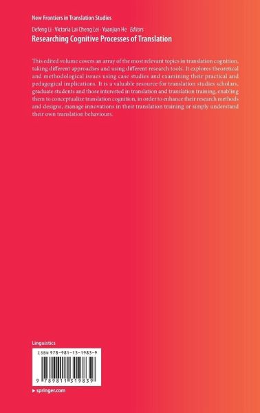 This edited volume covers an array of the most relevant topics in translation cognition, taking different approaches and using different research tools. It explores theoretical and methodological issues using case studies and examining their practical and pedagogical implications. It is a valuable resource for translation studies scholars, graduate students and those interested in translation and translation training, enabling them to conceptualize translation cognition, in order to enhance their research methods and designs, manage innovations in their translation training or simply understand their own translation behaviours.