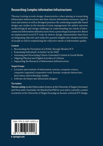 Thomas Ludwig reveals design characteristics when aiming at researching information infrastructures and their diverse information resources, types of users and systems as well as divergent practices. By conducting empirically-based design case studies in the domain of crisis management, the author uncovers methodological and design challenges in understanding new kinds of interconnected information infrastructures from a praxeological perspective. Based on implemented novel ICT tools, he derives design characteristics that focus on integrating objective and subjective queried insights into situated activities of people as well as emphasizing the subjective nature of information quality.