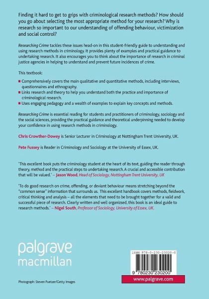 Introduction PART I: THE PRINCIPLES OF RESEARCH 1. Research as an Integrated Process 2. Connecting Research and Theory: Influences on Criminological Research 3. Crime Research and Criminological Theory PART II: THE PRACTICALITIES OF RESEARCH 4. Using Other People's Data: the Analysis of Official and Secondary Data 5. Asking Questions about Crime: Questionnaires and Surveys 6. Talking to People about Crime: Interviews and Focus Groups 7. Watching Crime and Crime Control: Ethnographic and Observational Research 8. Using Documents: Content, Conversation and Discourse Analysis 9. Mixed Methods and Triangulation Conclusion Appendix 1: An Internet Guide for Criminology Students Appendix 2: Interview Schedule for 'A study of the opportunities and barriers facing BME police officers' Appendix 3: Interview Schedule for 'An assessment of student attitudes to the death penalty' Glossary References.