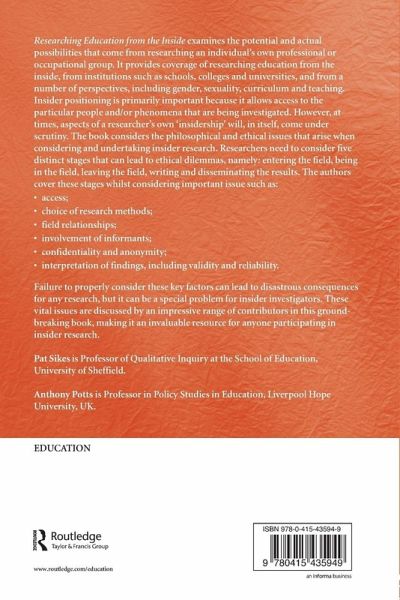 Researching Education from the Inside focuses on research projects that are undertaken by people who already have an attachment to the institutions or social groups on which their investigations are based. They can, therefore, be considered to be 'insiders'. In some cases their insider positioning is primarily important because it gets them access to the particular people and/or the phenomena that they want to investigate. At other times, however, aspects of their own 'insidership' will, in itself, come under scrutiny. Insider researchers need to consider five distinct stages that can lead to ethical dilemmas, namely: Entering the field, Being in the field, Leaving the field, Writing, and Disseminating the results. This book covers these stages whist considering important issues such as: Access, Choice of research methods, Field relationships, Involvement of informants, Confidentiality and anonymity, Interpretation of findings including validity and reliability. Failure to properly consider these key factors can lead to disastrous consequences for any research but it can be a special problem for insider investigators. These vital issues are discussed by an impressive range of contributors in this ground-breaking book, making it an invaluable resource for anyone participating in Insider Research.