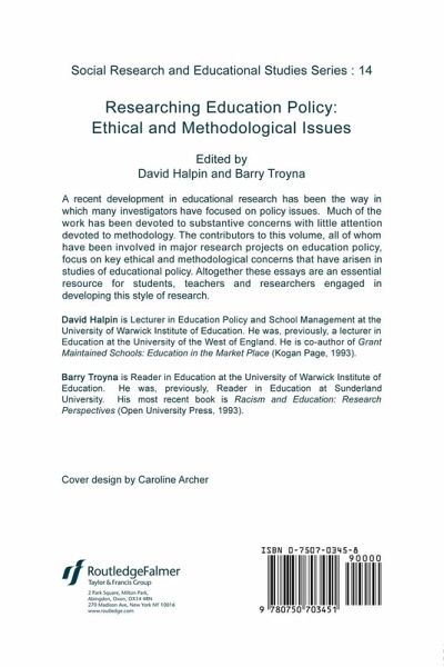 The methodology researching of educational policy is the subject of this book. It takes a "behind the scenes" look at the conducting, the analysis and the interpretation of research carried out into educational policy issues revolving around the 1988 Education Reform Act.; The contributors draw on their project research experience to demonstrate the breadth of issues lionked with such policy research, and cover the gender and power balance between interviewer and interviewee, the difficulties resulting from different ideological stances of researchers and researched, and difficulties in finding links between research and policy.