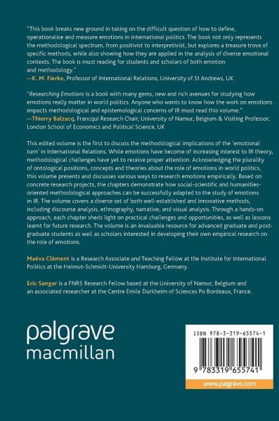 "This edited volume is a welcome, accessible and instructive addition to the discipline that makes a valuable contribution and develops a much-needed discussion about emotions in IR. It will speak to people of diverse methodological dispositions, both students and scholars, and shines a light on how to capture, interrogate and interpret what are subjective, and yet integral, dimensions of human relations." (Claire Yorke, International Affairs, Vol. 94 (3), May, 2018)