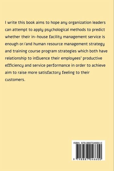This book indicates whether organization's facility management in-house department or outsourced department can achieve to improve its office or warehouse working environment to be more comfortable to let employees to feel in order to influence their productive efficiencies to be raised or improving their service performance to bring customers' more satisfactory feeling. I write this book aims to hope any organization leaders can attempt to apply psychological methods to predict whether their in-house facility management service is enough or/and human resource management strategy and training course program strategies which both have relationship to influence their employees' productive efficiency and service performance in order to achieve aim to raise more satisfactory feeling to their customers. I believe that effective facility management can improve better workplace environment to influence employee individual productive efficiency raising as well as effective human resource training course program can improve employee individual service performance in order to achieve customers to feel more satisfactory service performance in consequence for the organization's service.