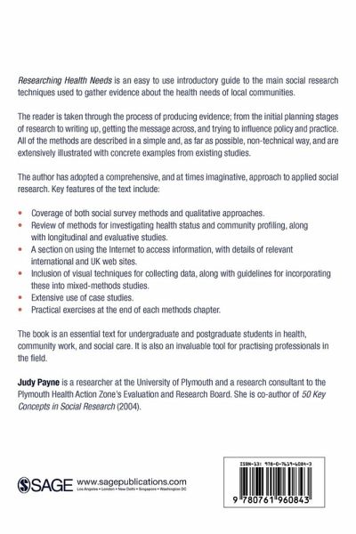 `[It is] difficult to find a single volume that addresses the specific range of methodological challenges [in] health needs assessment... Judy Payne's book is a very welcome answer to this problem. [This book] offers a lucid d logical exposition of the research process. It begins with a short introduction to the relevant policy context and a clarification of the terms `health', `need' and `community'. The following chapters cover the planning stage of a project... The book then moves on to the empirical stage of research... The volume concludes with a number of short case studies...It uses research terminology judiciously, providing clear explanations and illustrations. A useful selection of references to additional texts is also given. [T]he identification of a range of typical problems associated with the interpretation of official statistics will help would-be investigators to avoid drawing wrong conclusions about the health status of different groups. There is a useful and succinct description of a number of deprivation indices, together with relevant references. The sections on sampling strategies and the analysis of statistical data are particularly good in terms of coverage, clarity and explanation of technical terms. [As an all round `use-friendly' text, the book achieves its aim admirably. It presents a clear guide while at the same time conveying the challenges and possible pitfalls inherent in investigative research work. This book provides an invaluable resource for anyone planning to undertake needs assessment in the fields of health, community or social care. It also offers an excellent basic text on health and social research for undergraduate and postgraduate students' - Sociology
