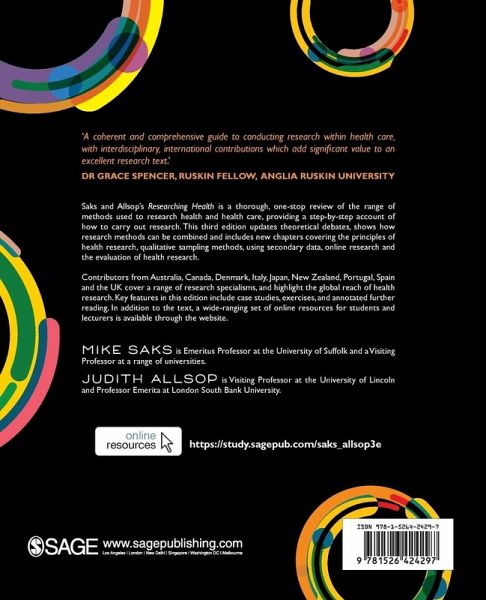 Saks and Allsop's Researching Health offers a comprehensive introduction to research methods for health care students and practitioners. The new third edition includes important theoretical updates, and further international content, with contributors from the UK, Italy, Japan, New Zealand, Portugal, Canada, and Spain, covering a number of specialisms and providing perspectives on core topics.