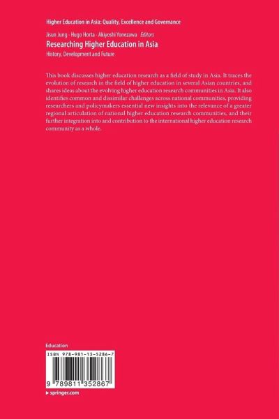 Chapter 1 Introduction: Higher Education Research as a Field of Study in Asia.- Part I: Conceptualization and Understandings of Higher Education Research in Asia.- Chapter 2 Higher-education researchers in Asia: The risks of insufficient contribution to international higher education researcher.- Chapter 3 Foil to the West? Interrogating perspectives for observing East Asian higher education.- Chapter 4 Higher education knowledge production in postcolonial-neoliberal Asia.- Chapter 5 Regionalism, regionalization of higher education and higher education research: Mapping the development in regionalization of higher education research.- Part II: East Asia.- Chapter 6 Higher education research in Japan: Seeking a connection with the international academic community.- Chapter 7 Higher education research in China: An independent academic field with an organized academic community.- Chapter 8 Higher education research in Hong Kong: Context, trends and vision.- Chapter 9 Higher educationresearch in South Korea: History, development, and challenges.- Chapter 10 What it is like and what needs to be done: A status report on higher education in Macau and its research.- Chapter 11 The development and progress of higher education research in Taiwan: Massification matters.- Chapter 12 Higher education research in Mongolia during transition period of development.- Part III: South East Asia.- Chapter 13 Researching higher education in "Asia's global education hub": Major themes in Singapore.- Chapter 14 Higher education as field of study in Malaysia: Towards an epistemic community of Practice.- Chapter 15 higher education research in Thailand: Current trends and development.- Chapter 16 Higher education research in the Philippines: Policies and prospects.- Part IV: South/West Asia.- Chapter 17 Education research and emergence of higher education as a field of study in India.- Chapter 18 Higher education research in Iran: Quantitative development and qualitative challenges.- Chapter 19 The regeneration aspects for higher education research in the Kingdom of Saudi Arabia.- Part V: Conclusion.- Chapter 20 Higher education research in Asia: History, development and challenges.