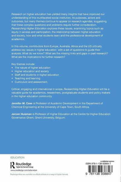 Research on higher education has yielded many insights that have improved our theoretical and practical understanding but there are still many themes that continue to appear on research agendas, provoking renewed focus on these complex questions and problems. Researching Higher Education explores these issues, examining topics such as equity in access and participation, the relationship between higher education and society, how and what students learn and the professional development of academics. Critical, engaging and international in scope, this book will be a valuable guide for academics, researchers, postgraduate students and policy makers in the higher education community.