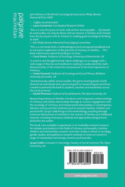 Researching Intimacy in Families introduces and invigorates understandings of intimacy and family relationships through an incisive engagement with the sociology of intimacy and interpersonal relationships in contemporary Western society and the methods used to research families, children and personal life. Using original data the book opens out the theoretical debate on intimacy and illustrates the potential of qualitative mixed-methods in capturing the richness and complexity of family life. Jacqui Gabb brings to life methodology teaching through extensive illustrations of methods in the context of families and childhood research, including innovatory methods and approaches designed and piloted by the author.