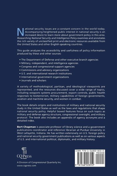 National security issues are a constant concern in todayÆs world. Accompanying heightened public interest in national security is an increased desire on the part of students, scholars, and professional researchers to learn more about government policy in this area. Written by an ARL librarian, Researching National Security and Intelligence Policy examines and annotates the rich variety of unclassified print and electronic resources available to users studying the formulation of national security policy in the U.S. and throughout the English-speaking world. ''''Resources analyzed for their accessibility and usefulness include U.S. Government executive branch documents and other national security policy documents produced by English language governments. Coverage includes the print and electronic literature produced by independent agencies and commissions, public policy and academic research think tanks, and in books and scholarly journals. ''''Background information on the origins and development of national security policy study in the U.S. is included as are sidebar features that provide unique and useful tips on high-interest national security topics including:''''Bioterrorism''Homeland security''Weapons of mass destruction ''Terrorist groups and sponsors ''Federal laws ''Treaties and alliances''''