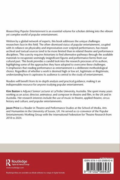 Written by a global network of experts, this book addresses the unique challenges researchers face in this field. The often-dismissed status of popular entertainment, coupled with its reliance on physicality and improvisation over scripted performances, has meant archival and textual sources tend to be more limited than in related theatre and performance disciplines. This scarcity requires historians to find alternative pathways through the available materials to recuperate seemingly insignificant figures and performance forms from our cultural past. This book provides a candid look into the research processes of its authors, highlighting some of the approaches they have adopted to overcome these challenges. It emphasises that reading performance as entertainment is a deliberate methodological choice. Regardless of whether a work isdeemed high or low art, legitimate or illegitimate, understanding how it captivates its audience is central to the study of entertainment.