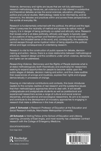 Violence, democracy and rights are issues that are not fully addressed in research methodology literatures, yet violence is of vital interest in substantive and theoretical debates across the social sciences, education, philosophy, politics and cultural studies. Methodology needs to be informed by, and be relevant to, the debates and practices within and across these perspectives on the worlds of everyday life. Research is fundamentally entwined with the political, the ethical and the legal. When it presumes the neutrality of method and ignores its radical roots of inquiry, it is in danger of being politically co-opted and ethically naïve. Research that reveals what is at stake politically, ethically and legally is typically open to accusations of being partisan and therefore political. It cannot avoid being political in the broadest sense of the word, and consequently the researcher cannot escape - through some mystical notion of being 'objective' - the political, ethical and legal consequences of undertaking research. Research is vital to the construction of public spaces for debate, decision making and action. Hence, there is a close relationship between methodological practices, research design and the conditions under which violence, democracy and rights can be addressed. Researching Violence, Democracy and the Rights of People explores what is at stake methodologically (both theoretically and practically) for researchers seeking to expand opportunities for people to become visible upon the public stages of debate, decision making and action, and thus make audible their experiences of wrongs and injustices, express their rights, and engage democratically in processes of change. Drawing on international contributions and contexts, this book introduces readers to the complex realities of real research and the substantive issues that their methodological approaches strive to deal with. It will benefit undergraduate and postgraduate students as well as post-doctoral and experienced researchers across a range of cultural and social science disciplines, as well as educational and sociological researchers. Its aim is to explore and contribute to the development of innovatory approaches to engaging in research that make a difference in the lives of people.