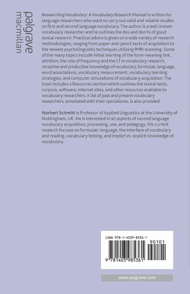 Researching Vocabulary: A Vocabulary Research Manual is written for language researchers who want to carry out valid and reliable studies on first and second language vocabulary. The author is a well-known vocabulary researcher and he outlines the dos and don'ts of good lexical research. Practical advice is given on a wide variety of research methodologies, ranging from paper-and-pencil tests of acquisition to the newest psycholinguistic techniques utilizing fMRI scanning. Some of the many topics include initial learning of the form-meaning link, attrition, the role of frequency and the L1 in vocabulary research, receptive and productive knowledge of vocabulary, formulaic language, word associations, vocabulary measurement, vocabulary learning strategies, and computer simulations of vocabulary acquisition. The book includes a Resources section which outlines the lexical tests, corpora, software, internet sites, and other resources available to vocabulary researchers. A list of past and present vocabulary researchers, annotated with their specialisms, is also provided.