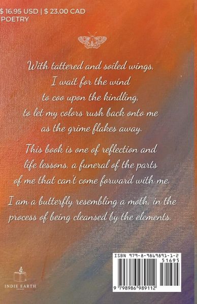 With tattered and soiled wings I wait for the wind to coo upon the kindling, to let my colors rush back onto me as the grime flakes away. This book is one of reflection and life lessons, a funeral of the parts of me that can't come forward with me. I am a butterfly resembling a moth, in the process of being cleansed by the elements.